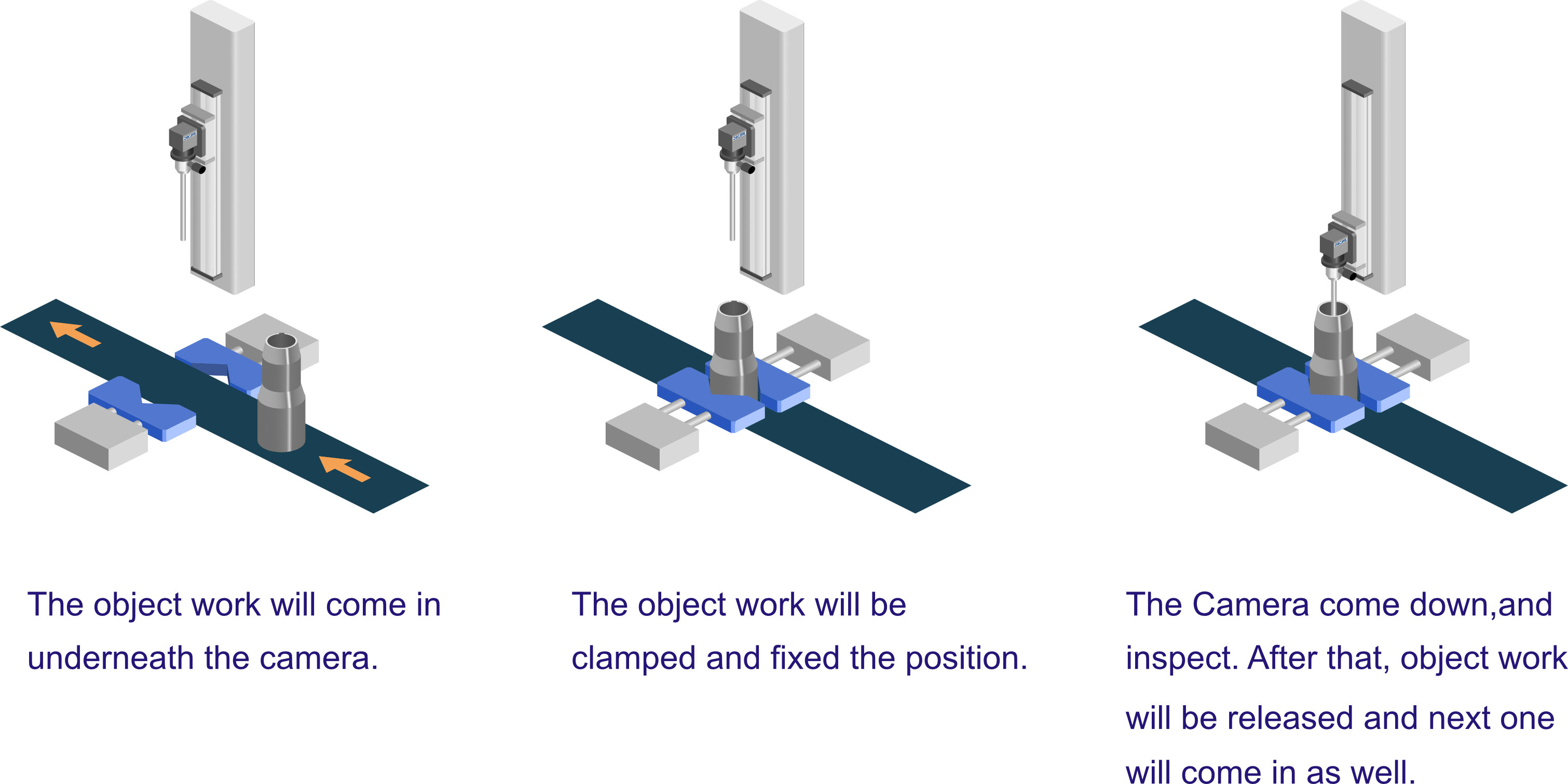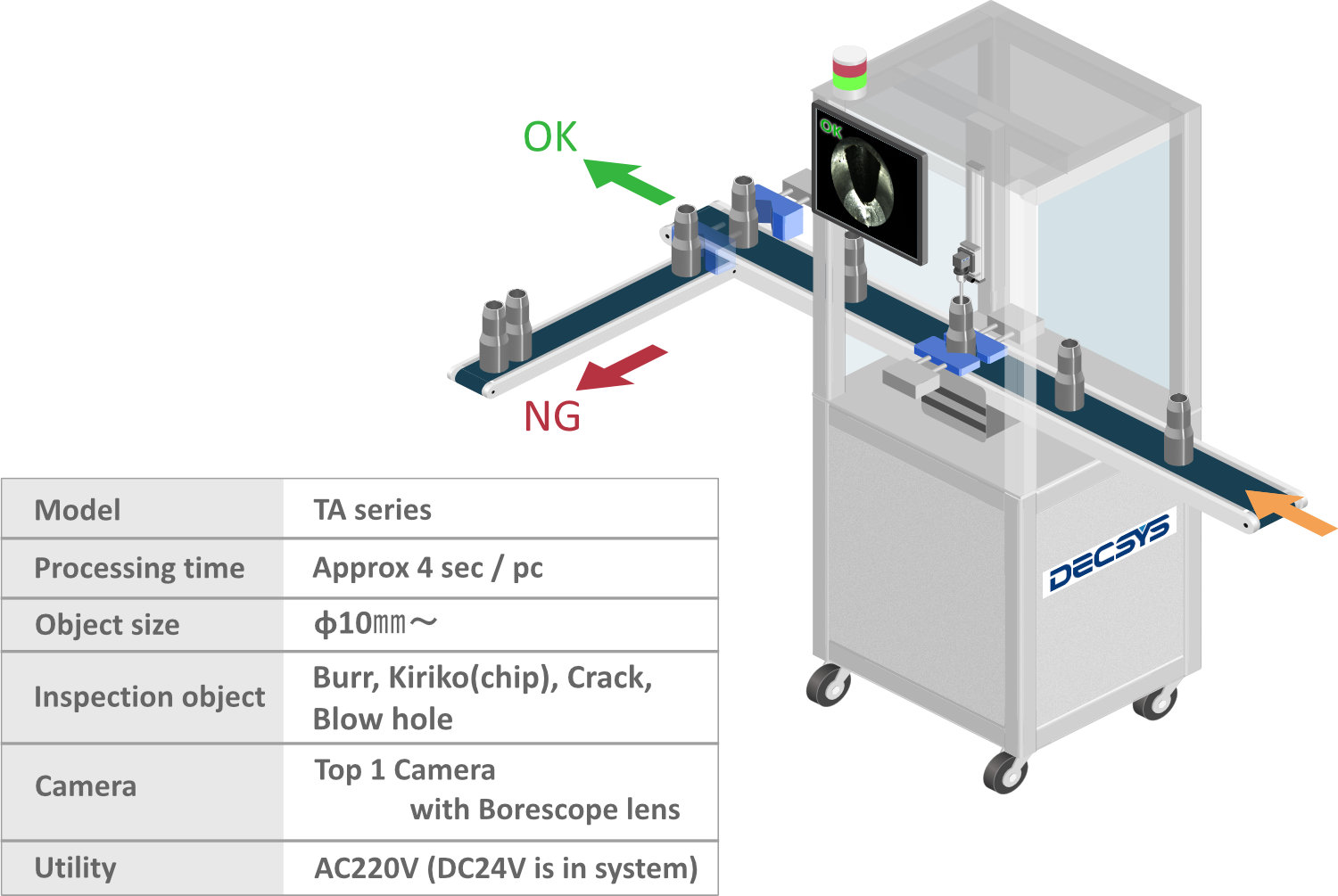 ชิ้นงานจะถูกส่งผ่านโดยสายพานลำเลียงและทำงานอัตโนมัติจนถึงการคัดแยก